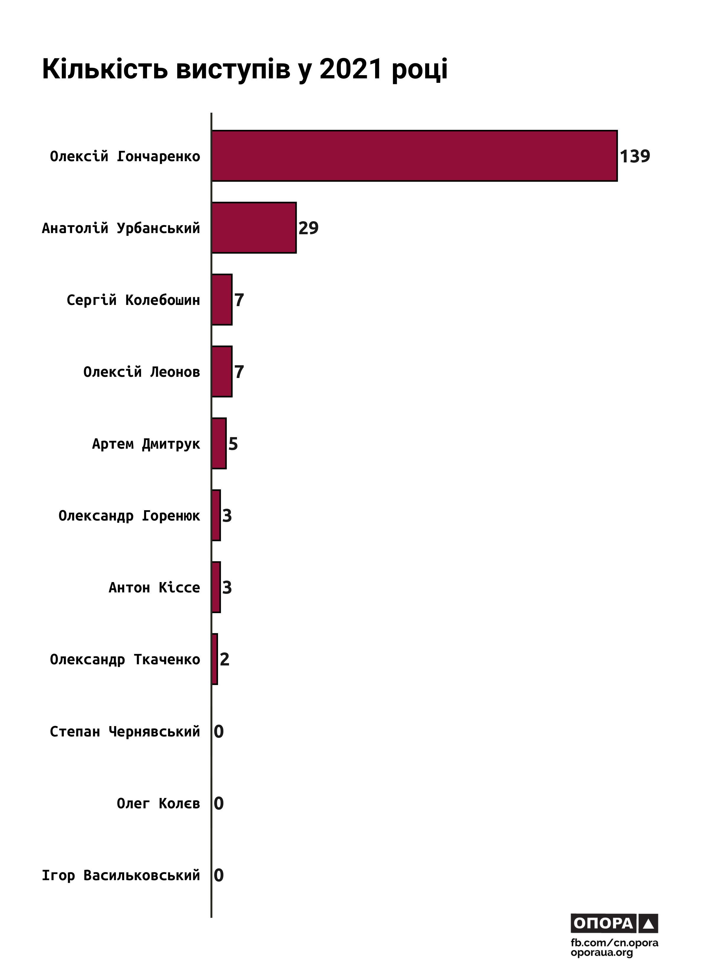 Троє депутатів жодного разу за рік не виступали, а Олексій Гончаренко, навпаки, більш 100 разів брав слово для виступу. Олексій Гончаренко також є лідером за голосуваннями проти лінії партії.