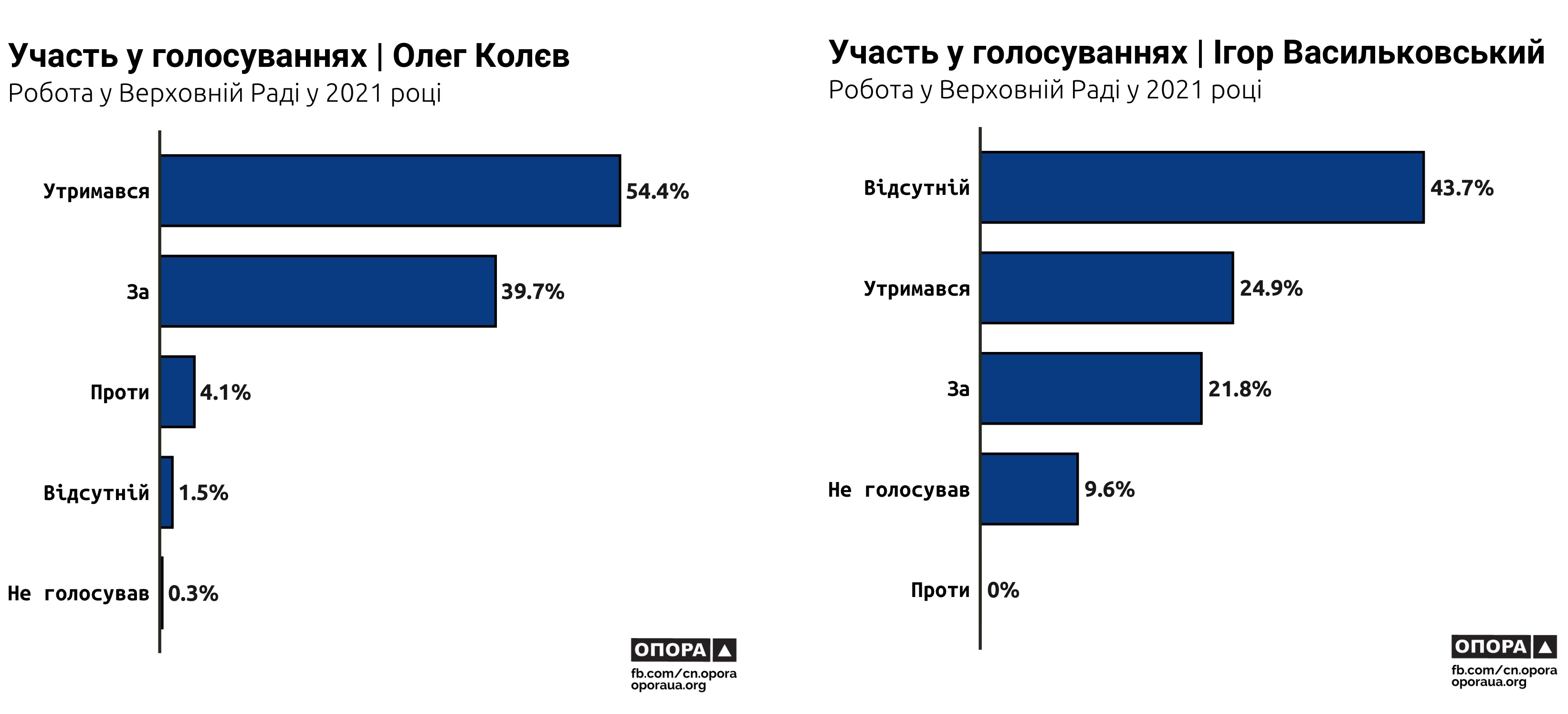 У 2021 році одеські мажоритарники у своїх голосуваннях найчастіше утримувалися – 42,3% таких голосувань від загальної кількості голосувань одеських парламентарів. Одразу четверо мажоритарників із Одеської області у своїх голосуваннях натискали кнопку "Утримався" в більшості своїх голосувань – Олег Колєв (54,4% голосувань), Олексій Леонов (53,6%), Степан Чернявський (52,5%) та Сергій Колебошин (51,5%). Найменше серед одеських мажоритарників утримувався Ігор Васильковський (24,9%).