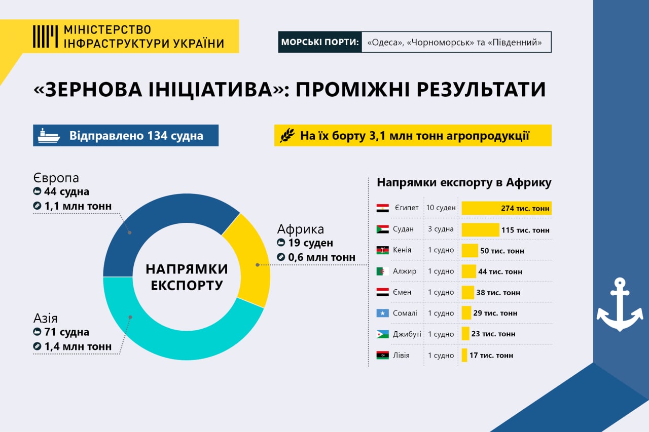 За 1,5 місяці роботи "зернового коридора" всього з українських портів вийшли 134 судна з агропродукцією для країн Азії, Європи та Африки. В Азію зокрема пішло 71 судно із 1,4 мільйонами тонн, до Європи - 44 судна із 1,1 мільйоном тонн та в Африку - 19 суден 600 тисяч тонн продовольства.