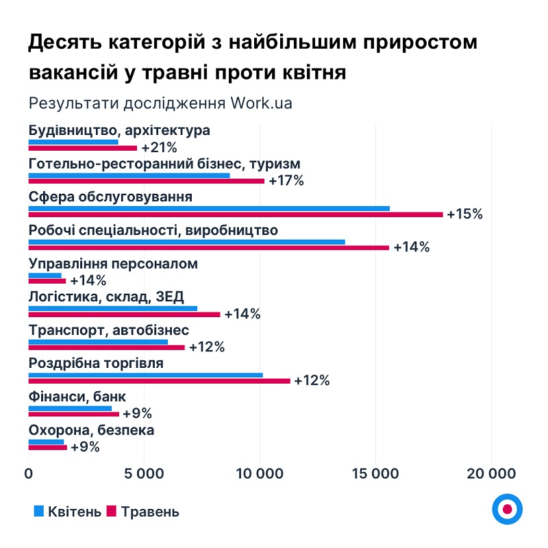 Найінтенсивніше приростали вакансії для посад "Водій екскаватора", "Маляр", "Виконроб", "Покоївка", "Водій навантажувача". Також зросла кількість вакансій за посадами різноробочий, будівельник, сантехнік, піцайоло, керуючий мережі магазинів.
