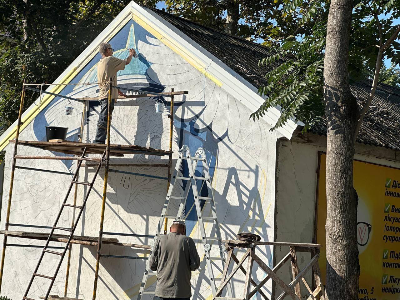 Так, на стіні майстерні ЗОШ № 2 за адресою Короленка 5 зображений сокіл, символізує силу, незламність та готовність захищати свій дім.