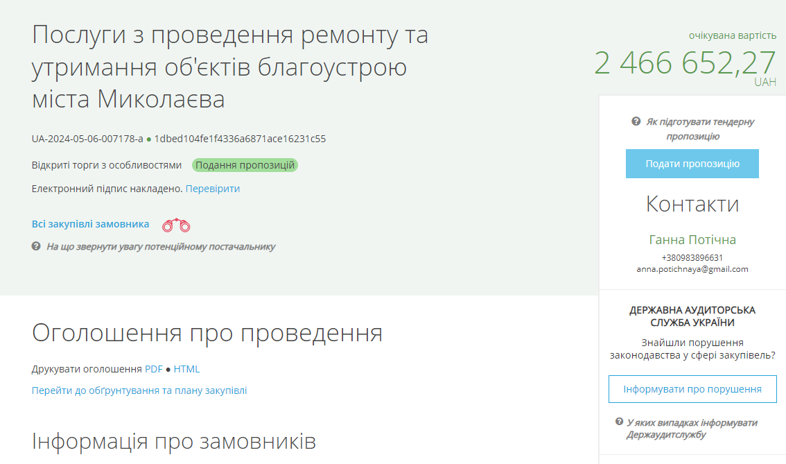 Так, на послуги з проведення ремонту та утримання об'єктів благоустрою міста Миколаєва готові витратити з бюджету два мільйони 244 тисячі 652 гривні.