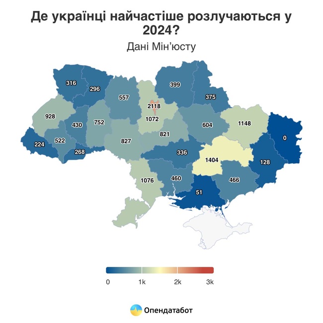 У антирейтингу за кількістю розлучень так само лідирує Київ — 2 118 розірвань шлюбу. Далі йде Дніпропетровська область (1404 розлучень) та Харківщина — там розірвало шлюб 1148 пар. В Одеській області розлучилися 1076 пар.