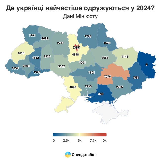 Столиця є незмінним лідером за кількістю одружень — 9 392 нових сімей. Друге місце посідає Дніпропетровська область — 7 076 шлюбів, а замикає трійку лідерів Одещина — 4 896 новостворених сімей.