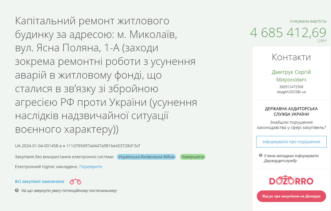 В одному з районів Миколаєва планують відремонтувати житловий будинок, пошкоджений внаслідок обстрілів рф. Підрядника обрали без аукціону, а на роботи готові витратити майже п’ять мільйонів гривень.