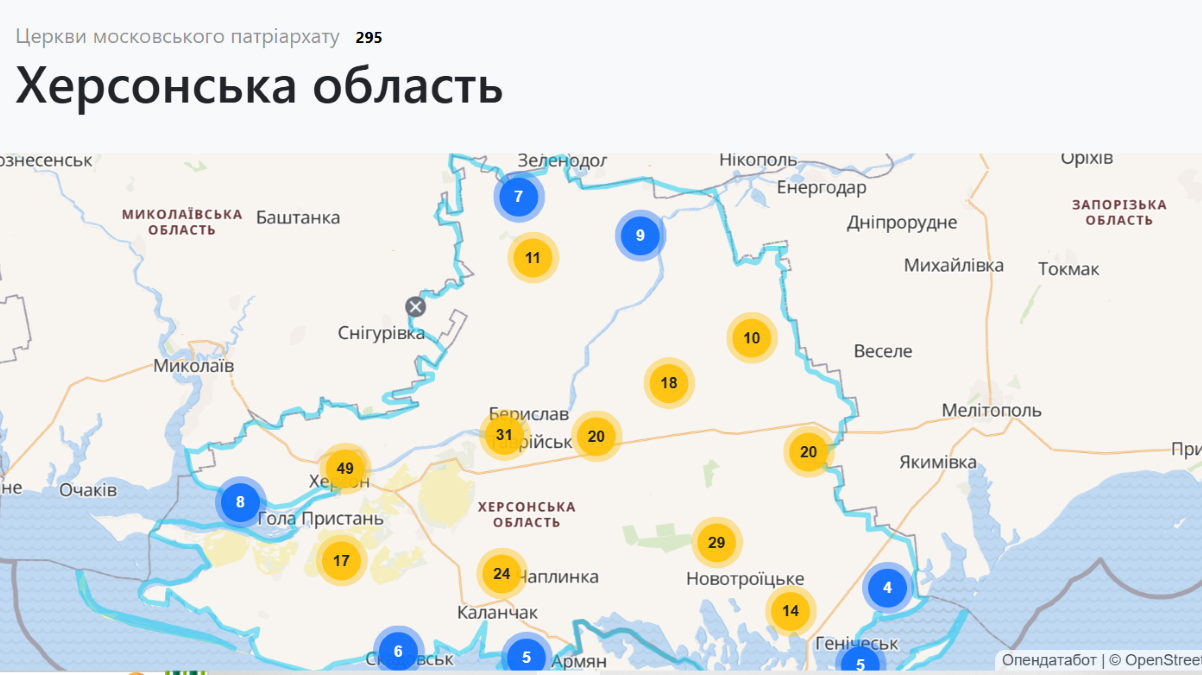 На Херсонщині залишаються майже три сотні церков, підпорядкованих московському патріархату. За даними сервісу Opendatabot, у регіоні офіційно зареєстровано 295 таких релігійних громад.