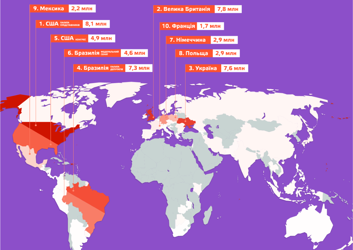 У 2024 році було відібрано топ-10 парламентських сайтів за такими критеріями: кількість відвідувань, тривалість і глибина перегляду, а також рівень відмов. У країнах із двопалатними парламентами аналізувалися дані обох палат.