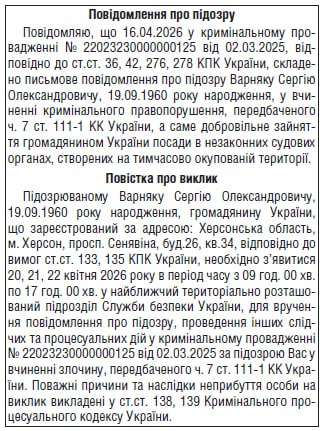 Колишньому судді Херсонського окружного адміністративного суду Сергію Варняку повідомили про підозру у колабораційній діяльності.
