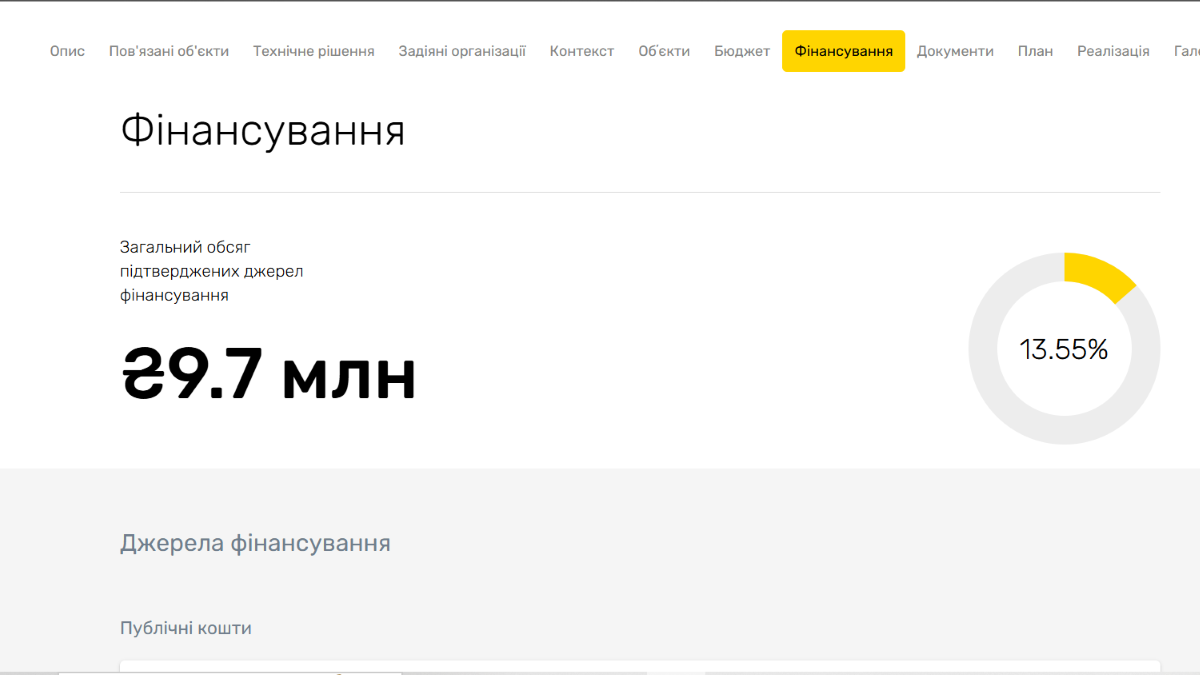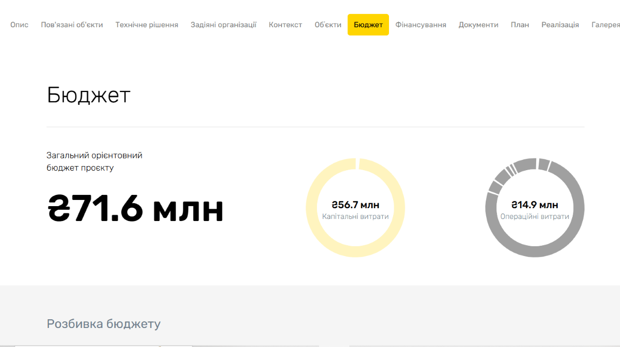 Загальний бюджет оцінюється у понад 71,6 мільйона гривень, з яких наразі підтверджено лише 13,55% фінансування. Основним джерелом коштів є місцевий бюджет, причому видатки розтягнуті на кілька років. З них капітальні витрати складають 56,7 мільйона, а операційні витрати сягають 14,9 мільйона гривень.