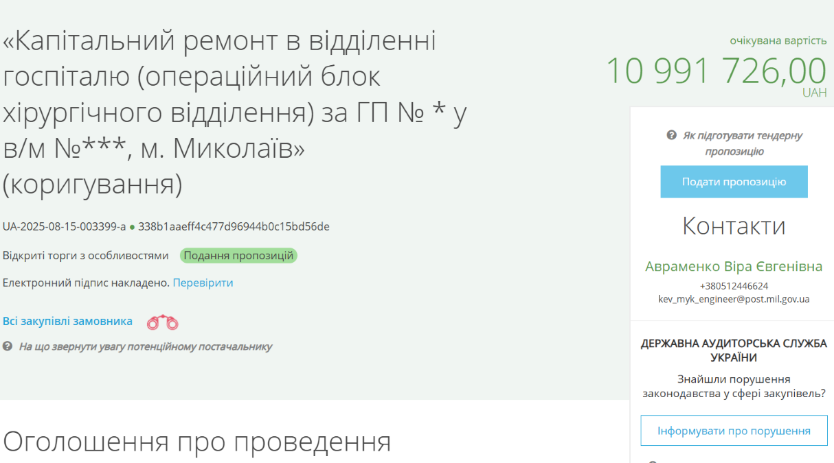 У Миколаєві оголосили тендер на капітальний ремонт операційного блоку хірургічного відділення військового госпіталю. Замовником виступило Квартирно-експлуатаційний відділ міста. На капітальний ремонт виділили 10,99 мільйона гривень.