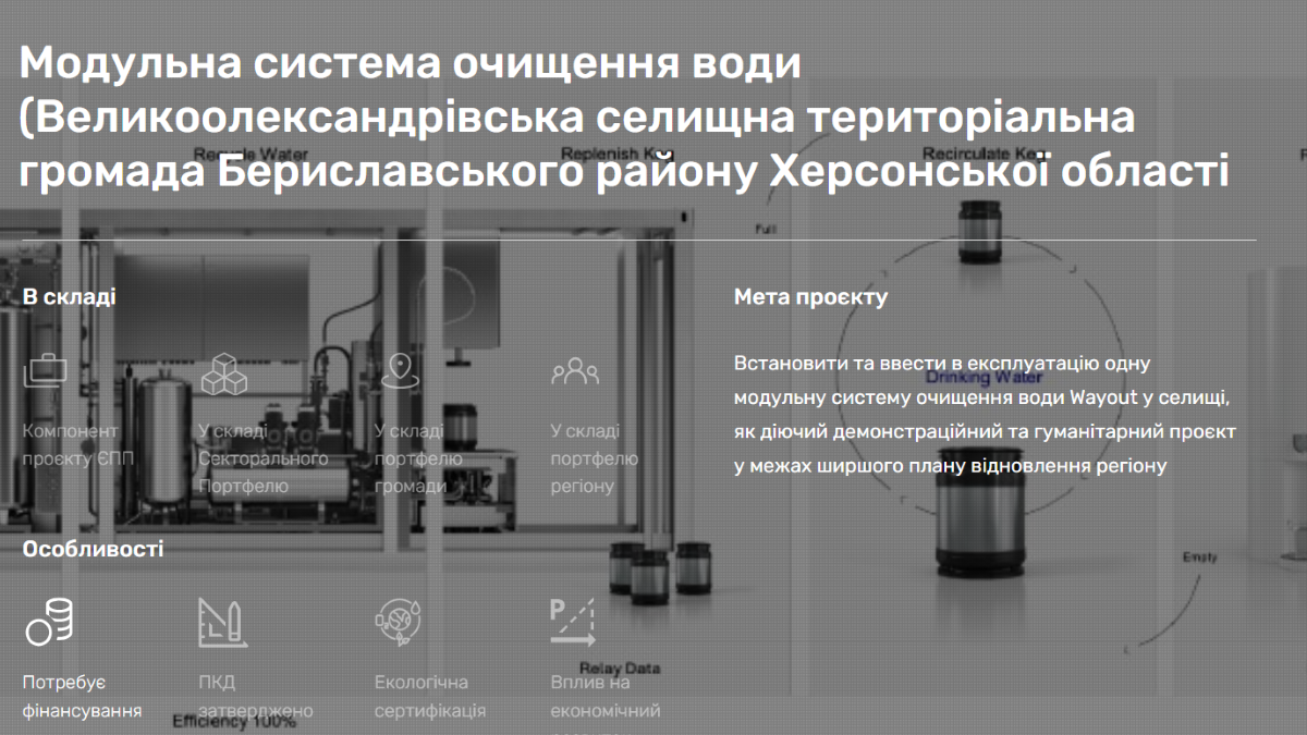 У Великоолександрівській громаді на Херсонщині встановлять модульну систему очищення води Wayout. Проєкт реалізується як пілотна ініціатива у межах першої фази програми водостійкості та відновлення регіону і має на меті забезпечити безпечну питну воду для близько 11,5 тисяч мешканців громади, серед яких понад 1,9 тисячі дітей та 3,6 тисячі людей похилого віку.