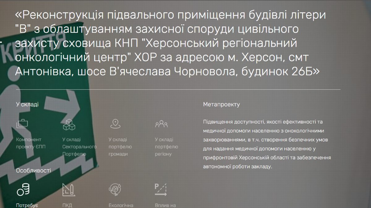 У Херсоні, на території КНП "Херсонський регіональний онкологічний центр" ХОР запланували реконструкцію підвального приміщення будівлі літери "В". Тут планується облаштувати сучасне укриття — захисну споруду цивільного захисту, що забезпечить безпеку пацієнтів і медперсоналу. Об’єкт розташований у смт Антонівка.
