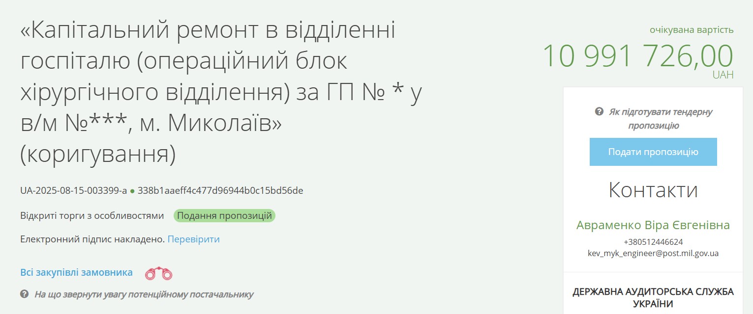 Замовником виступив Квартирно-експлуатаційний відділ Миколаєва. Тендер проведуть через відкриті торги, приймання пропозицій триватиме до 31 серпня, а аукціон запланований на 1 вересня. У разі неякісного виконання робіт, підрядник зобов'язаний усунути недоліки, інакше йому загрожує штраф у розмірі повної вартості ремонту.