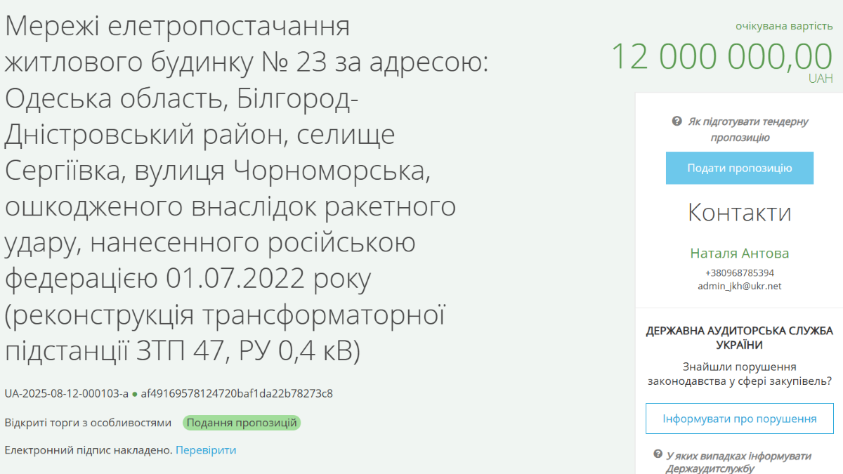 Очікувана вартість робіт становить 12 мільйонів гривень. Пропозиції від учасників прийматимуть до 27 серпня, а того ж дня запланували провести аукціон. Мінімальний крок зниження ціни для учасників тендеру становить 1%, тобто 120 тисяч гривень до 31 грудня 2025 року.