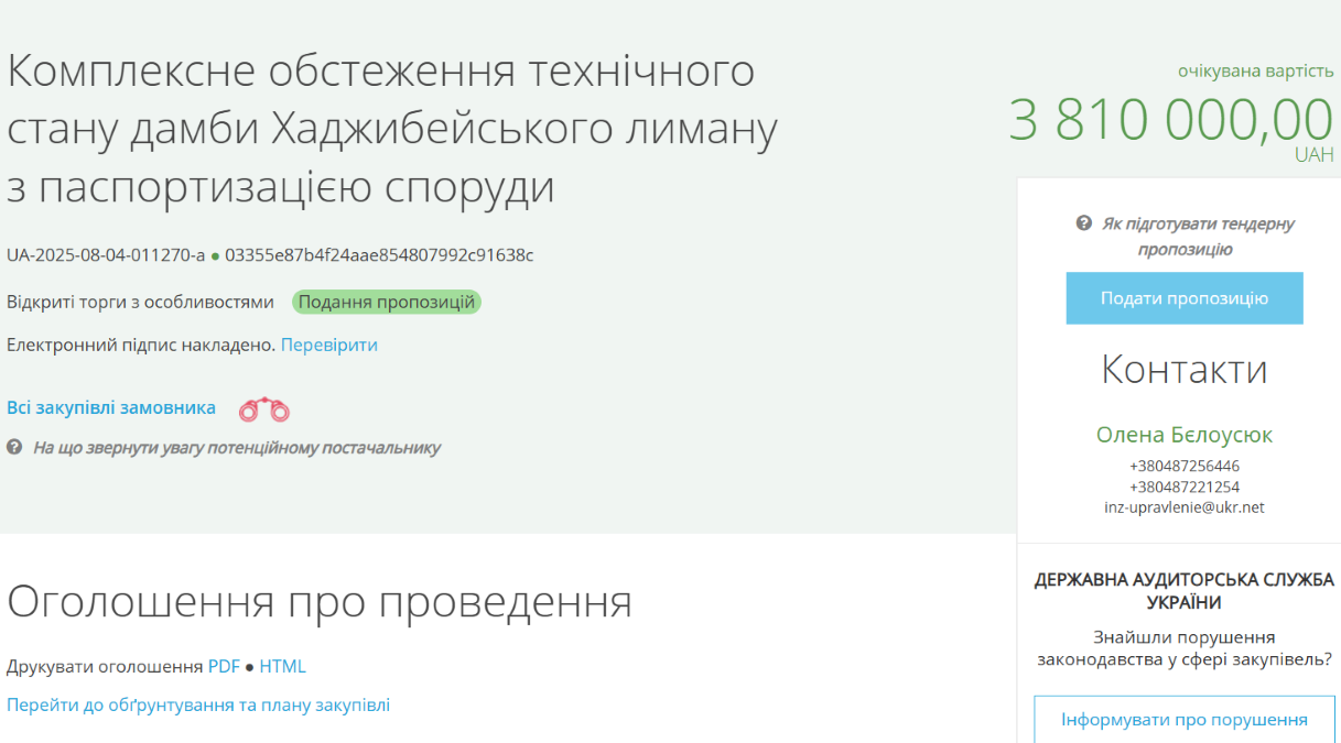 Управління інженерного захисту території міста та розвитку узбережжя Одеської міськради оголосило тендер на комплексне обстеження технічного стану дамби Хаджибейського лиману з подальшою паспортизацією споруди. Очікувана вартість закупівлі становить 3,81 мільйона гривень.