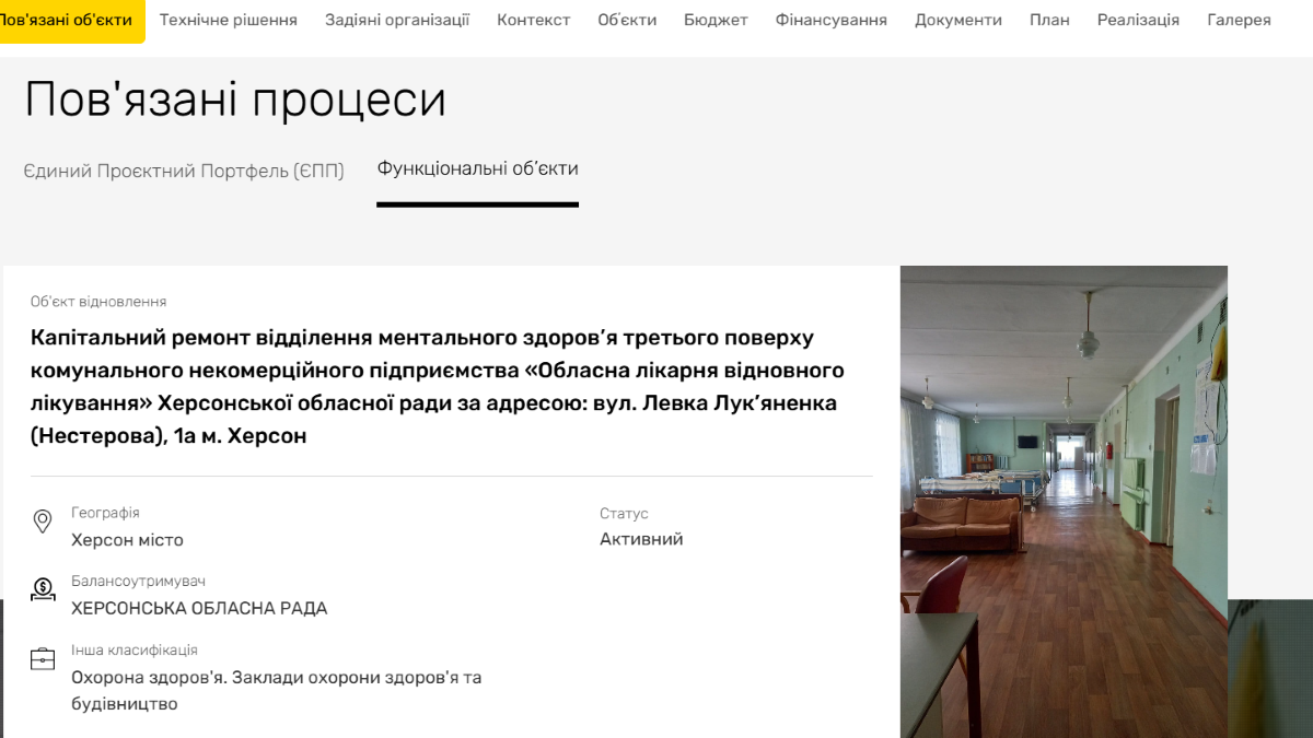 Проєкт передбачає повне оновлення приміщень для надання психотерапевтичної та психіатричної допомоги мешканцям Херсонської області, зокрема людям із посттравматичними та психосоматичними розладами, тривожними станами, депресіями та іншими психологічними проблемами.