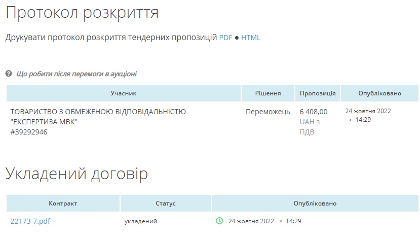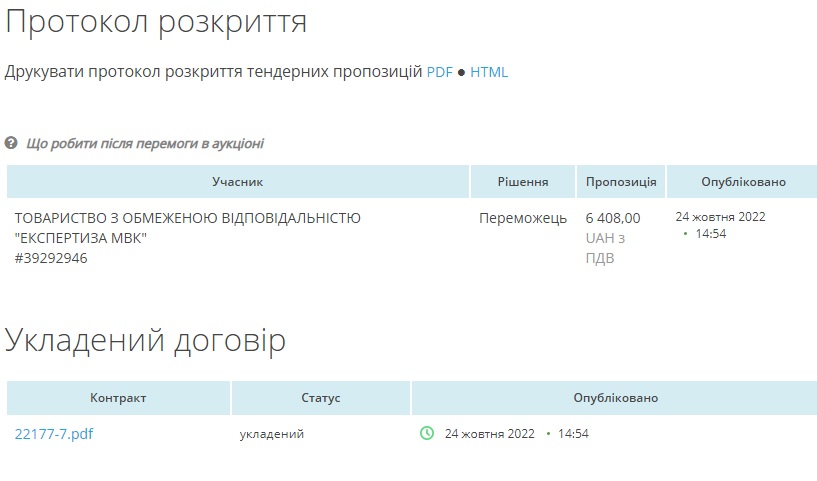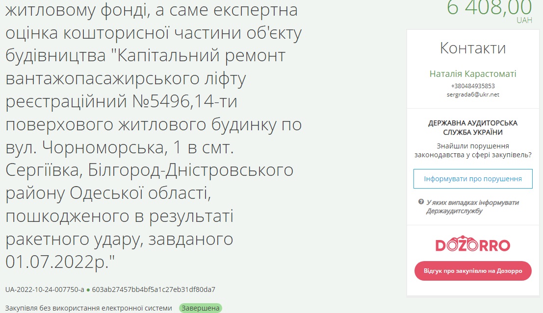 Шість закупівель провели без використання електронної системи й угоди уклали із товариством з обмеженою відповідальністю "Експертиза МВК". З цим ж ТОВ селищна рада уклала угоди щодо аналогічної експертної оцінки ремонту ліфтів у 14-поверховому житловому будинку по вулиці Чорноморська, 1, що також постраждав від ракетного удару 1 липня.