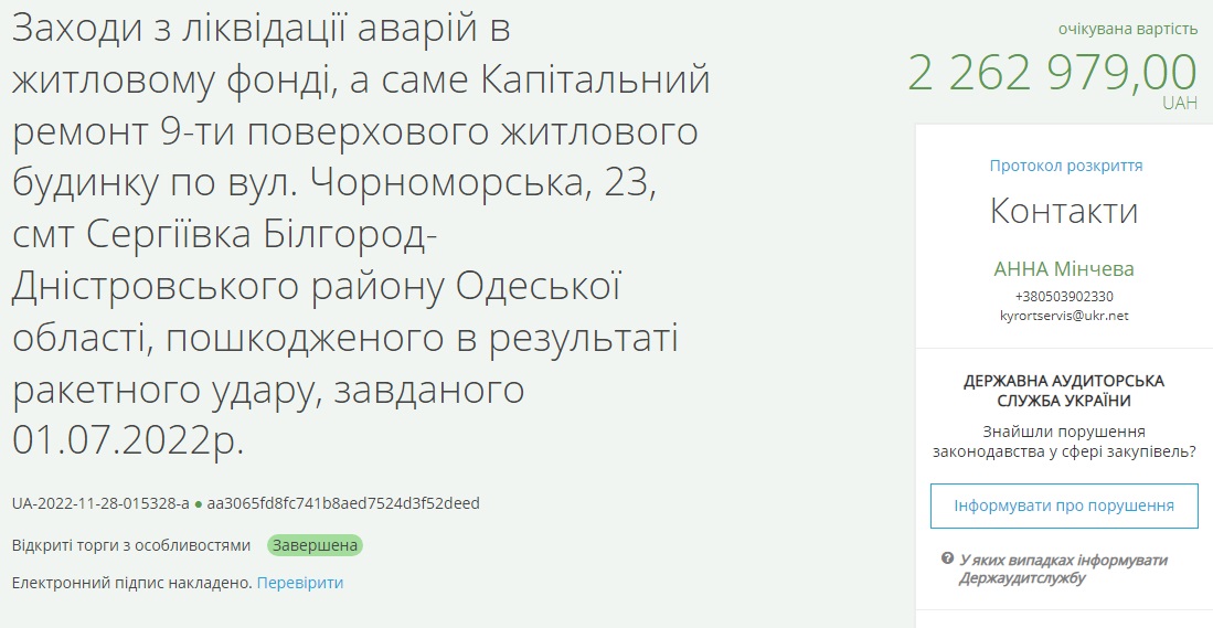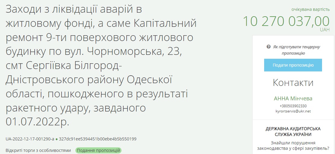 Комунальне підприємство "Курорт-Сервіс" Сергіївської селищної ради" оголосило тендер для пошуку компанії, якій заплатять за капітальний ремонт дев'ятиповерхового житлового будинку по вулиці Чорноморська, 23, у селищі міського типу Сергіївка Білгород-Дністровського району Одеської області, пошкодженого в результаті ракетного удару, завданого 1 липня.
