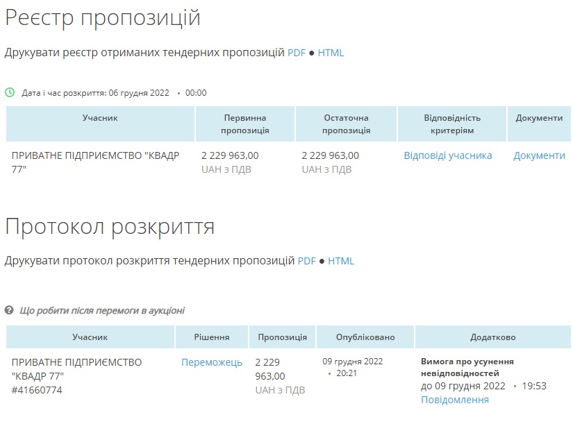 Розкриття пропозицій у тендері з очікуваною вартістю закупівлі 10 мільйонів 270 тисяч гривень має відбутися 27 грудня. Закупівля запланована як "відкриті торги з особливостями".