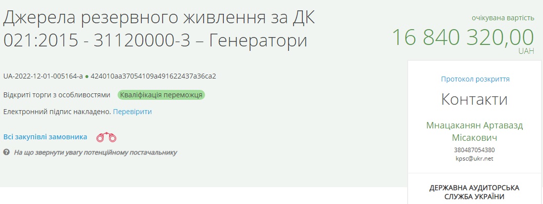 Згідно із даними системи Prozorro "Маржінал Строй" має поставити свої генератори до 20 грудня.