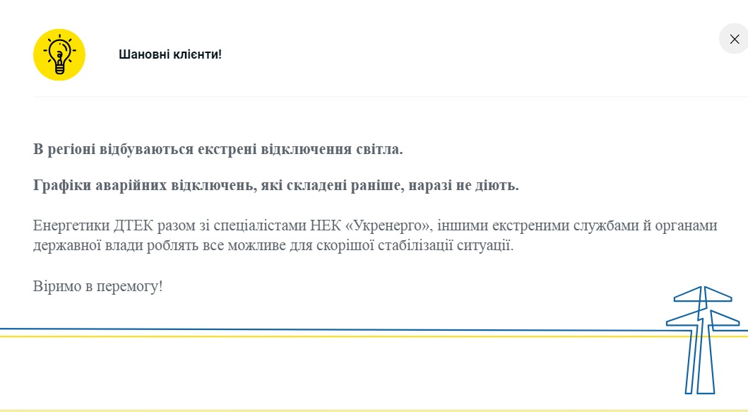 Наприклад, 21 листопада зранку компанія ДТЕК Одеські електромережі повідомив про введення стабілізаційних відімкнень, а за годину вже повернулися до екстрених.