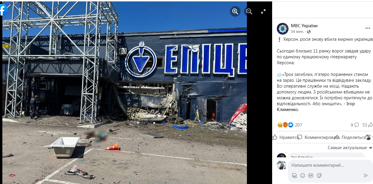 Артилерія росії вбила трьох людей у херсонському гіпермаркеті