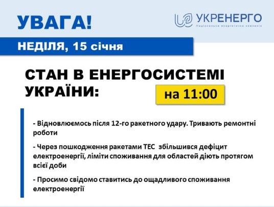 В компанії наголошують, що ворог намагався прицільно бити по блоках теплових електростанцій (ТЕС). Через пошкодження обладнання вони припинили або знизили виробіток електроенергії, і в енергосистемі збільшився дефіцит. Це змусило дещо знизити ліміти споживання, пропорційно для всіх областей. Обмеження діють протягом всієї доби (15 січня, - ред.). При їх перевищенні будуть застосовані аварійні відключення. Отже, для споживачів терміни відключень можуть збільшитись.