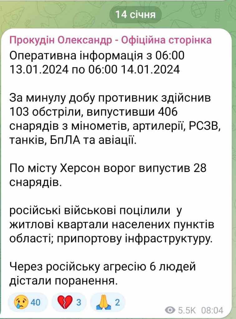 Раніше, 11 січня військові російської окупаційної армії здійснили 73 обстріли правобережної частини Херсонщини, випустивши 310 снарядів з мінометів, артилерії, РСЗВ, танків та БпЛА. Через російську агресію одна цивільна людина загинула, ще три – дістали поранення.