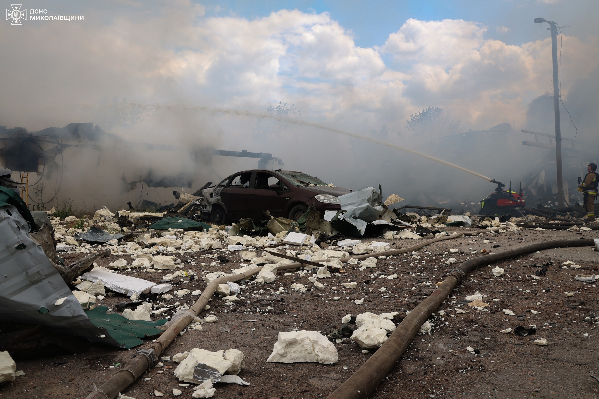 У Миколаєві поцілили у промислову зону, загальною площею 400 квадратних метрів. Рятувальники ліквідують пожежу.