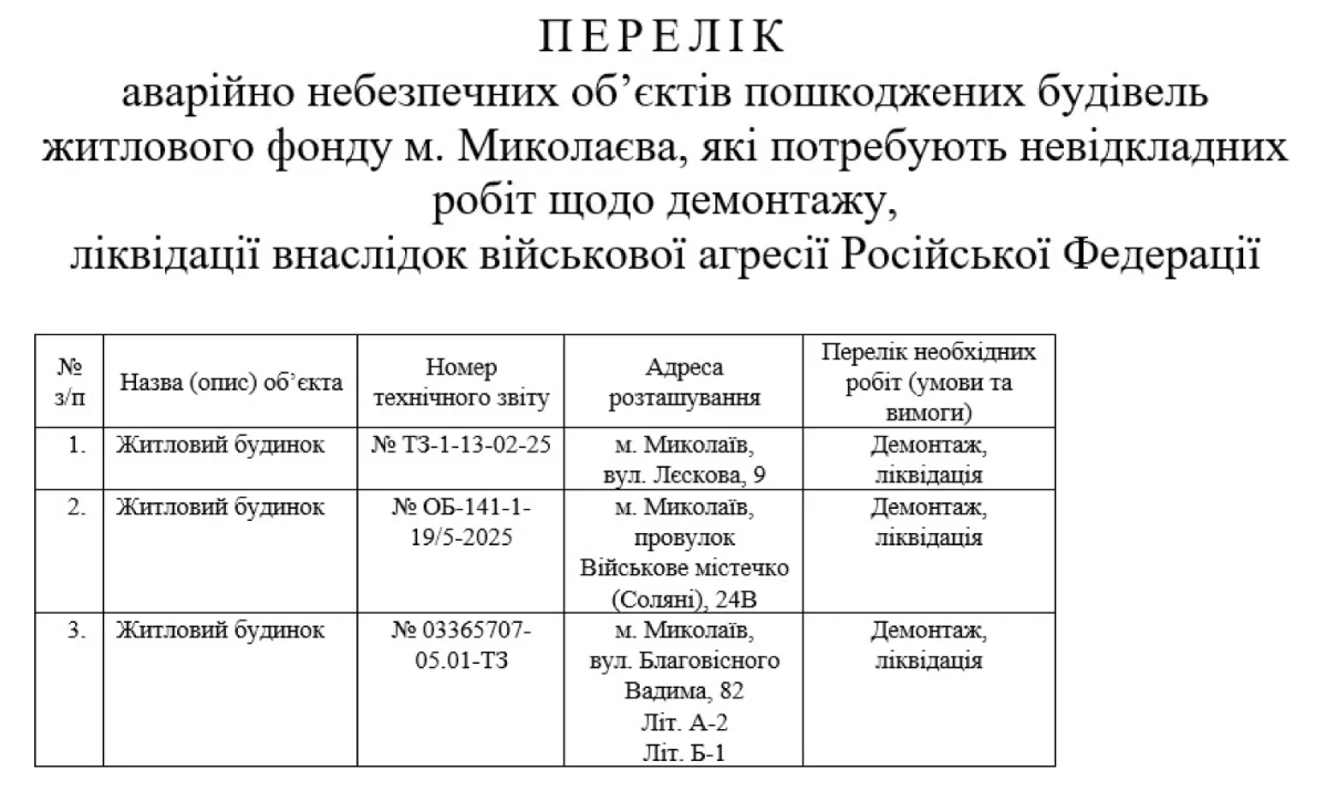 Миколаївська міська рада погодила перелік житлових об'єктів пошкоджених чи зруйнованих внаслідок агресії окупанта. Їх рекомендовано демонтувати: частково або повністю.