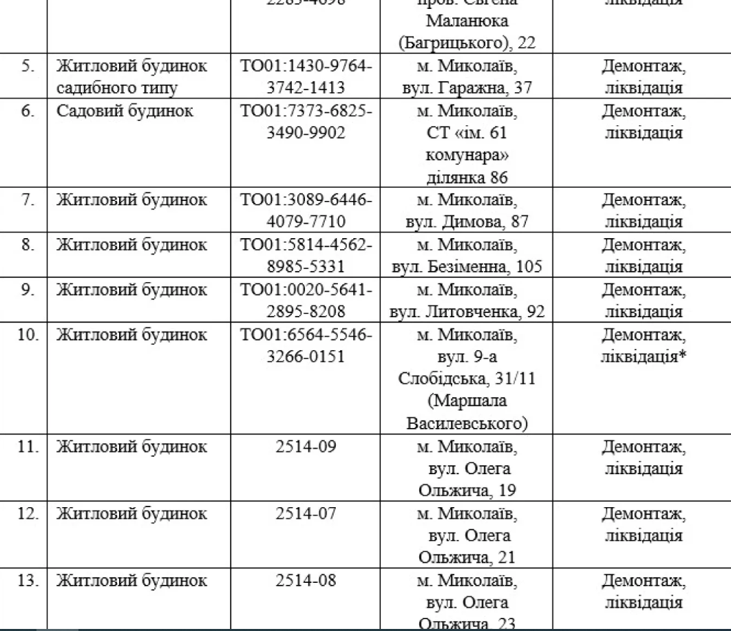 Зокрема, експертом житлово-комунальної комісії Миколаївської міської ради надано висновок про необхідність повного демонтажу будівлі за адресою вулиця 9-а Слобідська, 31/11 (Маршала Василевського). Водночас будівля за данною адресою є частиною житлового багатоквартирного будинку.