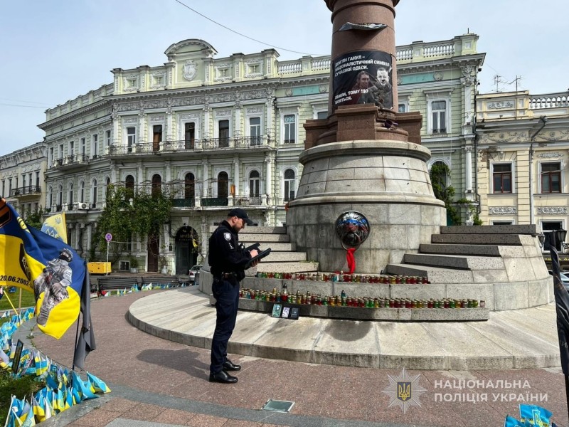 16 травня 2025 року перехожа повідомила поліції, що на постаменті посеред Європейської площі невідомі намалювали російський прапор, а одне з пам'ятних фото було забруднене. Тоді правоохоронці склали адмінпротокол за дрібне хуліганство. Виявилось, малюнок намалювала жінка, яка торік намагалась вивісити там російський прапор і публічно підтримала дії рф. 8 жовтня 2024 року вона залізла на цей же постамент з російським прапором, щоб закріпити його на ньому, але її помітили перехожі та завадили.