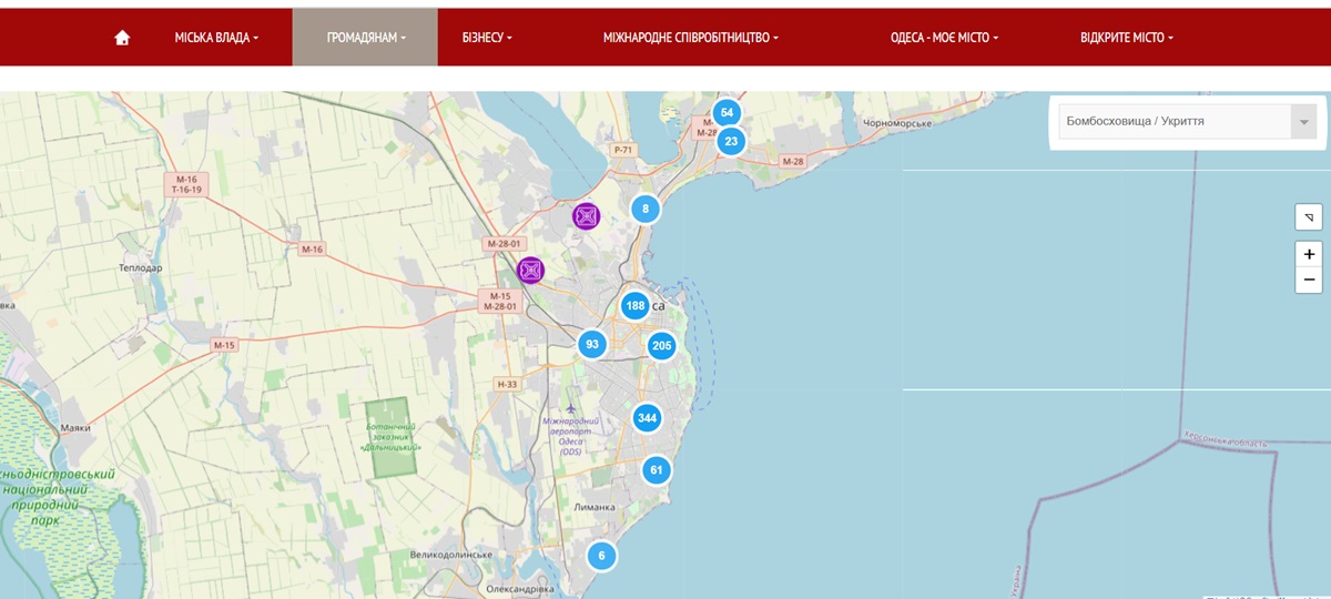 Так виглядає мапа сховищ та укриттів в Одесі. ФОТО: Скрин сайту Одеської міськради
