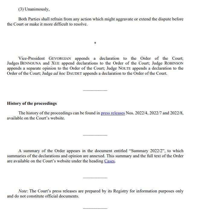 Заступник голови ГЕВОРГЯН додає декларацію до наказу Суду; Судді БЕННУНА та СЮЕ додають декларації до наказу Суду; Суддя РОБІНСОН додає окрему думку до наказу Суду; Суддя НОЛЬТЕ додає декларацію до наказу Суду; Суддя ad hoc ДОДЕ додає декларацію до наказу Суду.
