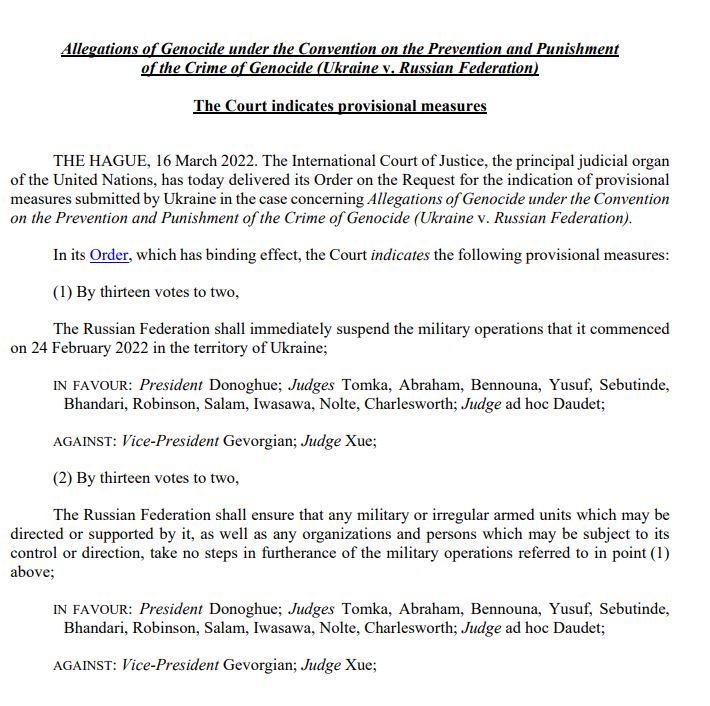 Сьогодні, 16 березня, Міжнародний суд ООН визначив тимчасові заходи у відношенні рф.