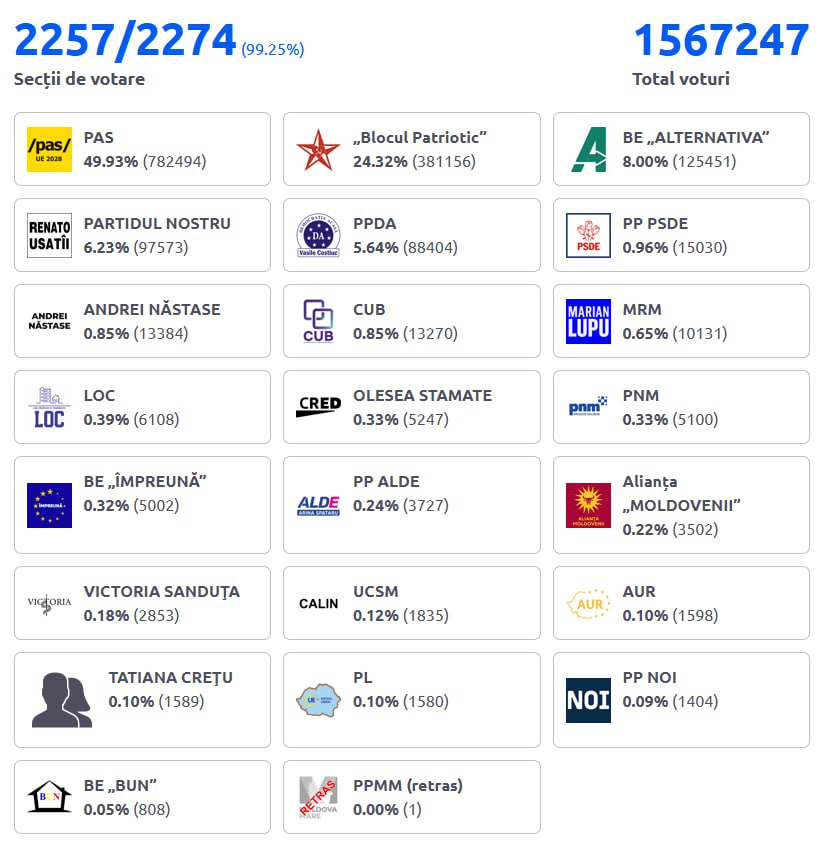 На другому місці — опозиційний "Патріотичний виборчий блок", одним із лідерів якого є колишній президент Ігор Додон, що виступає за зближення з Росією. За цей блок проголосували 24,26% виборців.