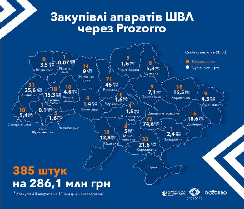 Больше всего ИВЛ через Prozorro приобрели в Днепропетровской (79), Киевской (71), Херсонской (33) и Львовской (31) областях. Меньше всего - в Ровенской, Ивано-Франковской и Запорожской областях. Там закупили только по одному аппарату.