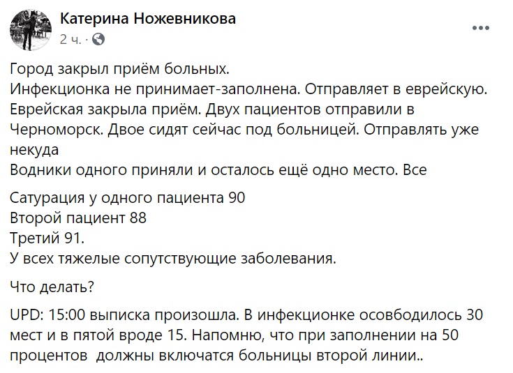 По состоянию на 15:00 она же сообщила, что из больниц выписали пациентов и там освободились места.