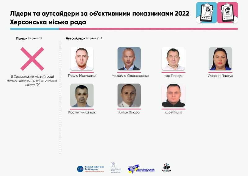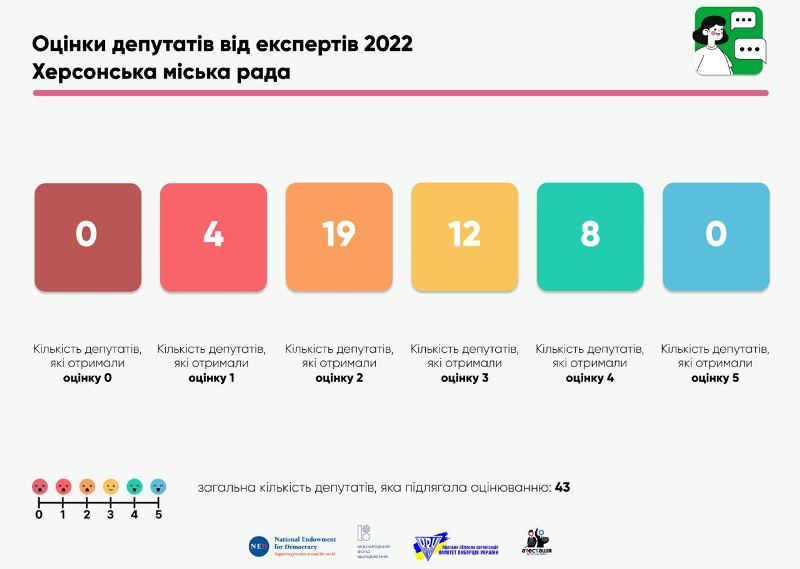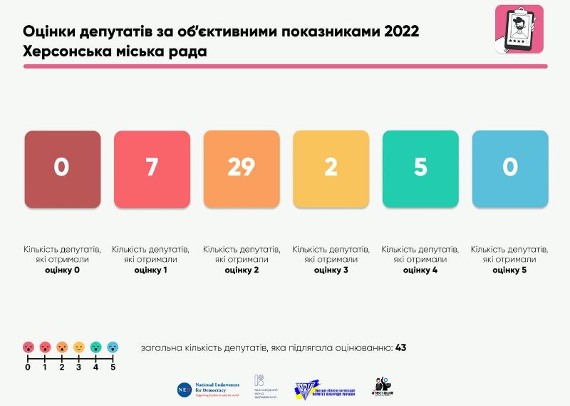 Деталізація місцевих оцінок. У порівнянні з першим роком каденції 63% депутатів Херсонської міської ради VIII-го скликання погіршили свої оцінки: це 12 депутатів з фракції "Нам тут жити", 5 депутатів з фракції "Європейська Солідарність", 5 депутатів з фракції "Слуга народу", 8 позафракційних депутатів. Варто зауважити, що позафракційними вважались всі депутати, які належали до фракцій заборонених партій — "Блок Сальдо" і "ОПЗЖ".