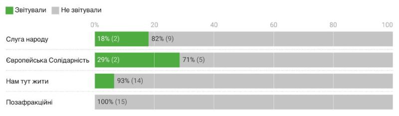 Про свою роботу розповіли лише 5 депутатів: 2 представників фракції "Слуга народу" (Євгенія Бєла, Андрій Медведєв), 2 депутати від фракції "Європейська Солідарність" (Олександр Ложичев, Оксана Погомій) та 1 депутат від фракції "Нам тут жити" (Віталій Бєлобров). Попри те, що цього року звітування мало більш формальний характер, 90% депутатів Херсонської міської ради не представили публічні звіти про свою діяльність.