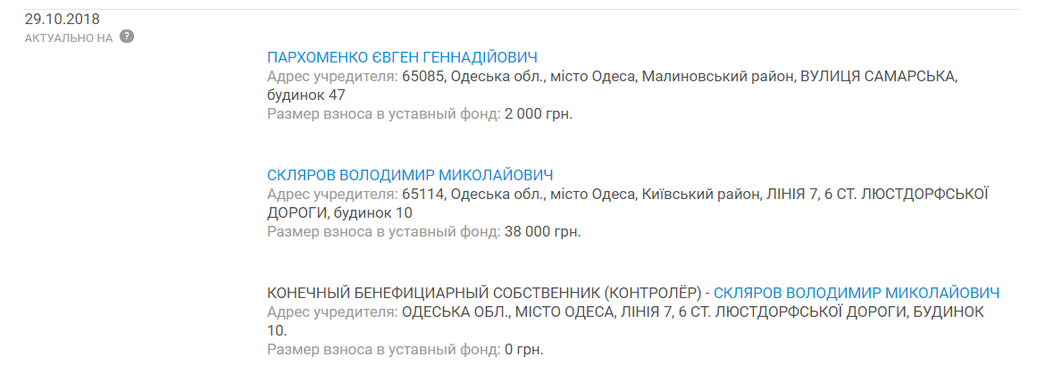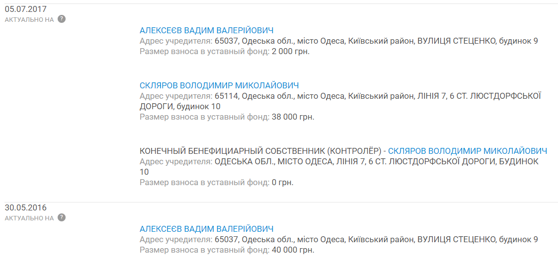 Втім, за даними сервісу YouControl, так було не завжди. Ще станом на листопад 2020 року у компанії були інші власники - одесити Володимир Скляров та Євген Пархоменко, а до 2018 року замість Євгена Пархоменка компанією володів Вадим Алєксєєв, який був її єдиним власником у 2016 році.