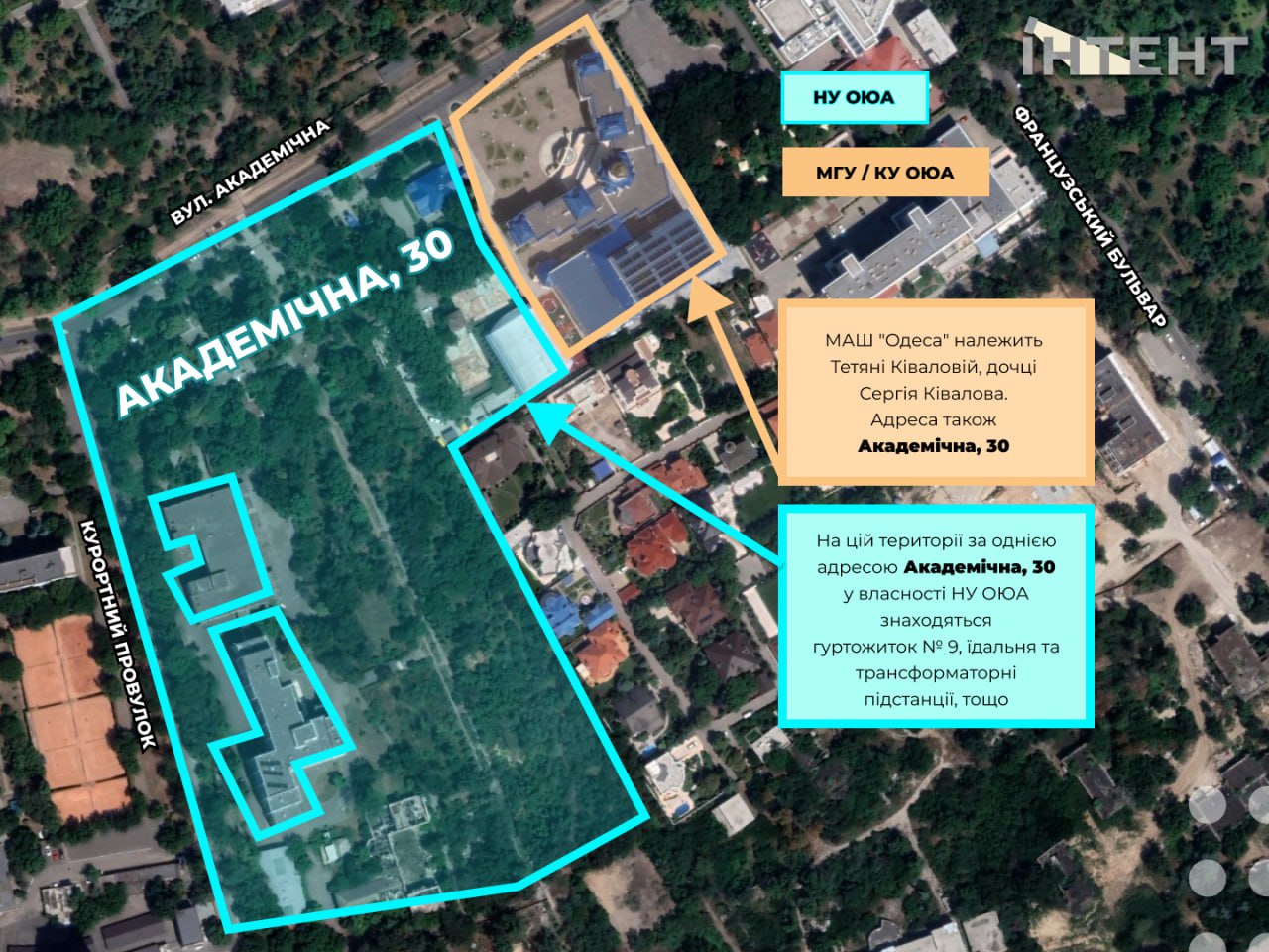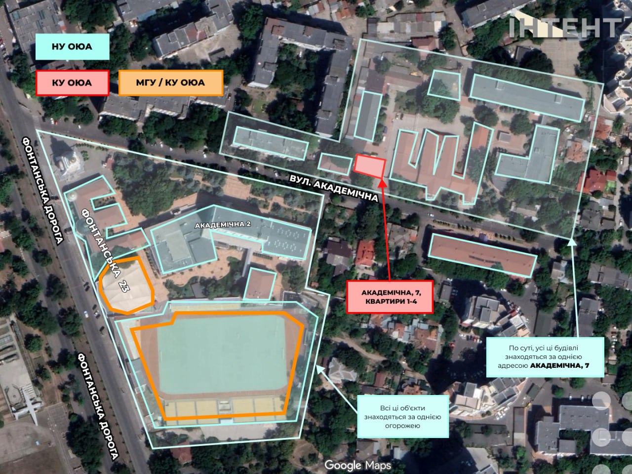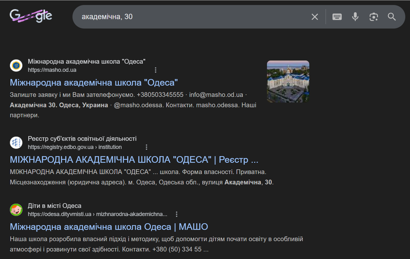 Також Інтент помітив, що, якщо шукати в пошуковику за цією адресою - Академічна, 30 – то гугл видає не будівлі юракадемії, а саме МАШ "Одеса".