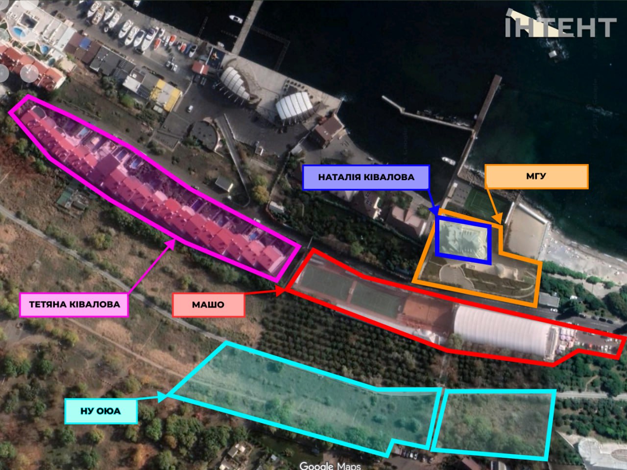 Йдеться про будівлю з білим дахом на фото. Це насправді медичний факультет Міжнародного гуманітарного університету (МГУ). Офіційна адреса тут Фонтанська дорога, 23а. А власниками МГУ в рівних долях є Тетяна Ківалова та Сергій Кос’яненко – донька й онук Ківалова.