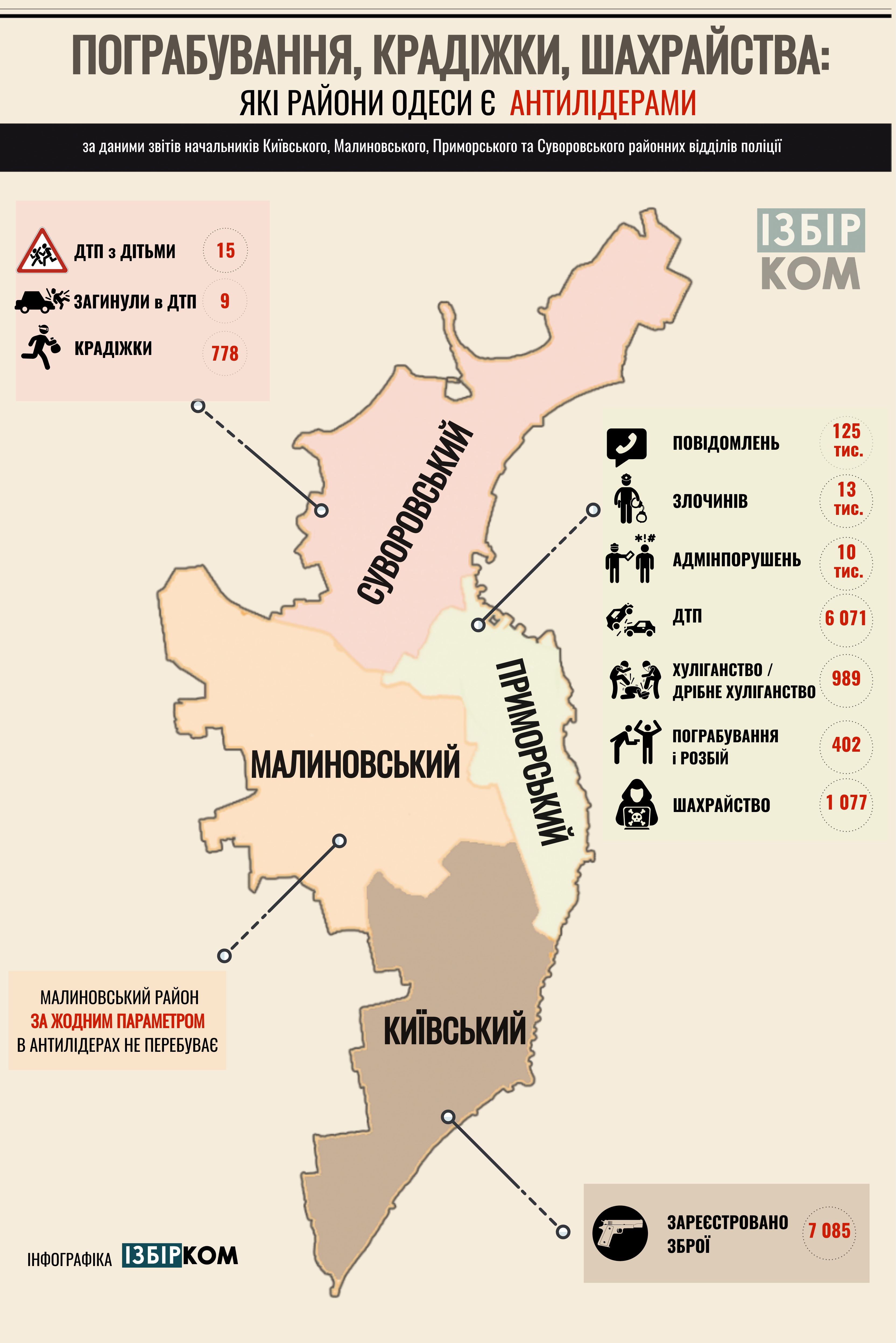 Також варта уваги інформація про злочини, які сталися в Одесі з використанням зброї. У Приморському районі таких злочинів зафіксували 263, по одному – у Суворовському та Київському та жодного – у Малиновському. Крім того, торік у Суворовському районі був зареєстрований один вибух.