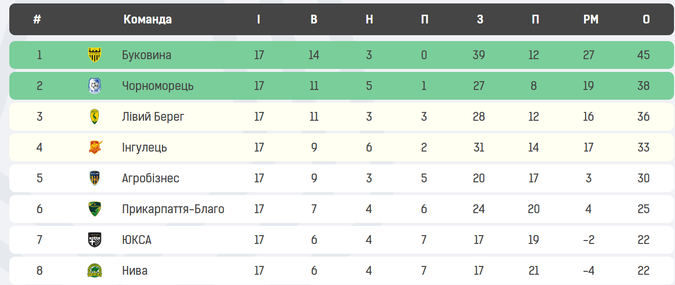 Турнірна таблиця Першої ліги. СКРИНШОТ: pfl.ua
