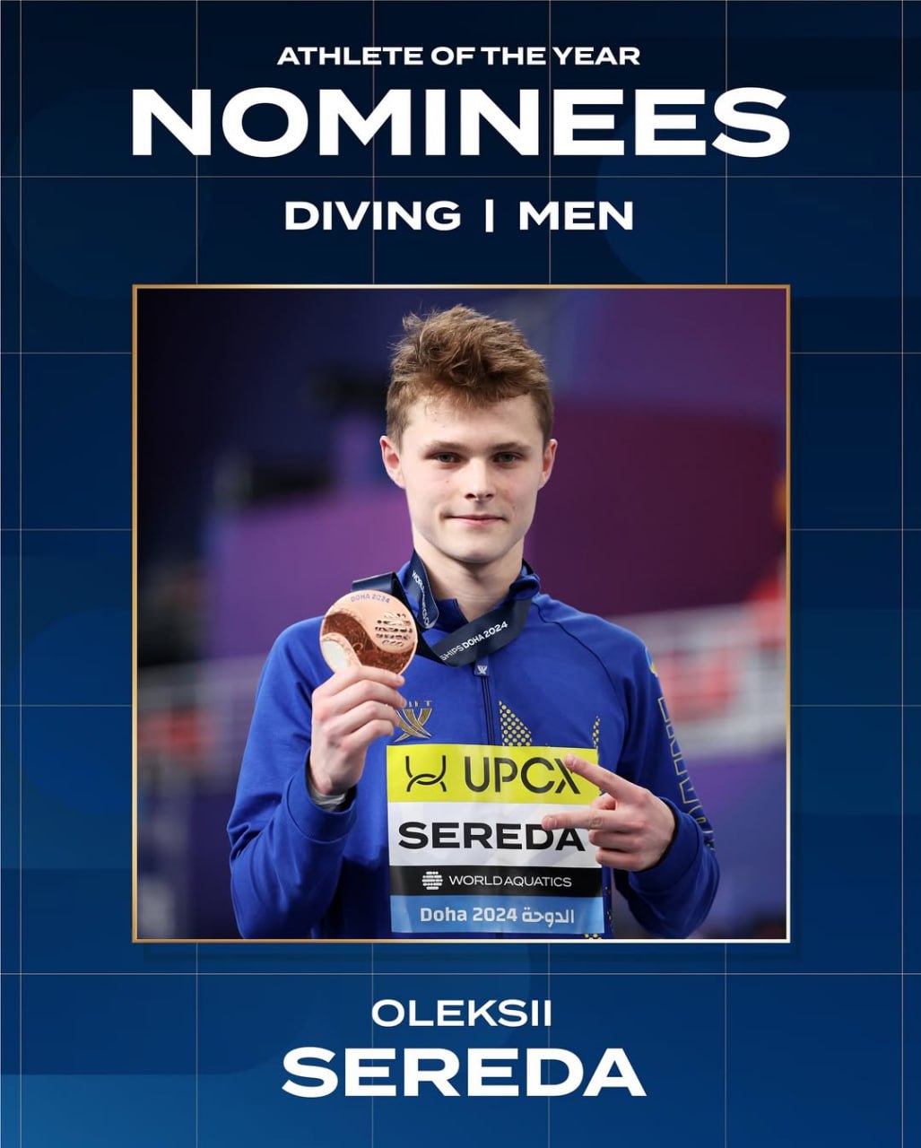 - Олексій Середа був номінований на звання "Спорстмен року" у стрибках у воду за версією World Aquatics. 19-річний миколаївець став другим на цьогорічному чемпіонаті світу, а також здобув третє (у парі з Марком Гриценком) та четверте місця на суперфіналі Кубку світу.