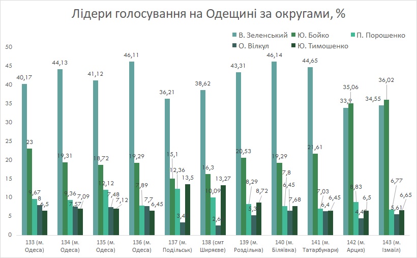Що ж стосується попередніх результатів, то, відповідно до електронного підрахунку голосів, результати яких оприлюднено центральною виборчою комісією, на дев’яти з 11 виборчих округів перше місце посів кандидат Володимир Зеленський, але в бессарабських районах (центри округів в Арцизі та Ізмаїлі) його обійшов Юрій Бойко. Здебільшого на всіх округах третє місце посів чинний президент Петро Порошенко, причому найбільше він набрав на півночі області – в окрузі №137 з центром у Подільську. А у трьох округах Юлія Тимошенко посіла третє місце: №№ 137, 138 і 139. При цьому в округах №№ 137 і 138 дещо інакше виглядає п’ятірка лідерів: до неї не потрапив Олександр Вілкул, але натомість п’яте місце посів Олег Ляшко.