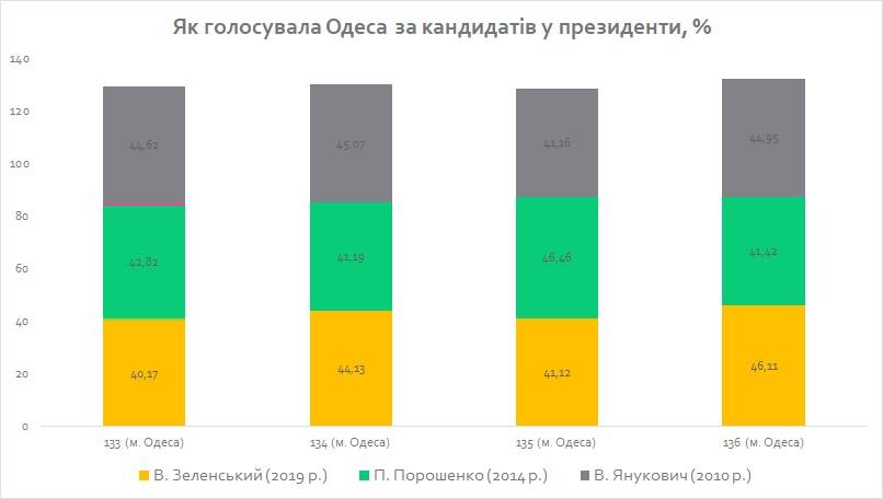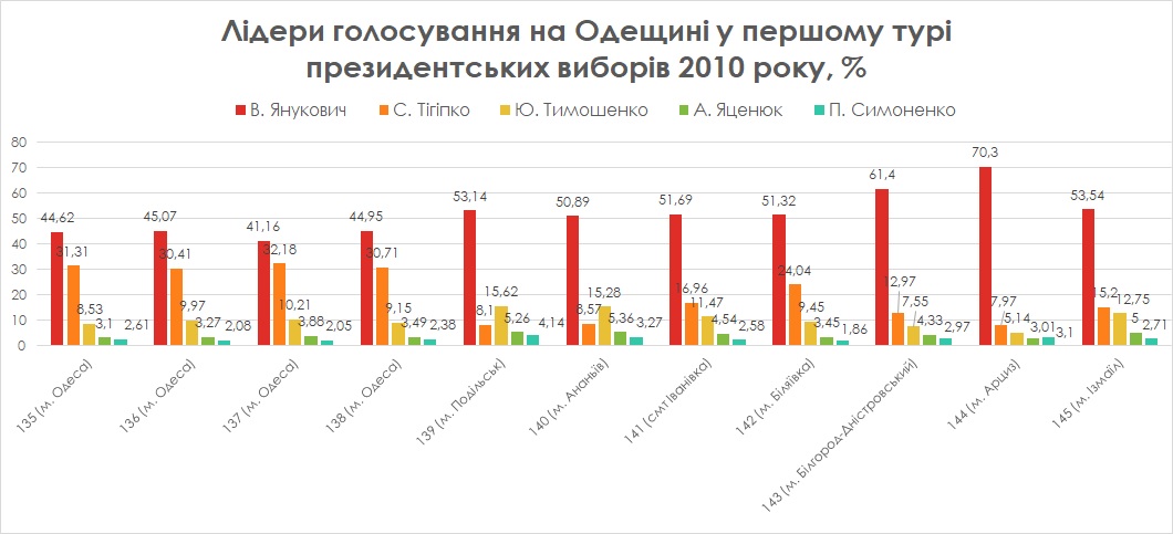 Що ж стосується першого туру виборів-2010, то тоді першість отримав Віктор Янукович: найбільше голосів йому віддали виборці округу №144 (центр - м. Арциз) – 70,3%. А м. Одеса проголосувало за нього приблизно на тому ж рівні, що через чотири роки – за П. Порошенка, а ще через п’ять – за В. Зеленського: від 41 до 45%.
