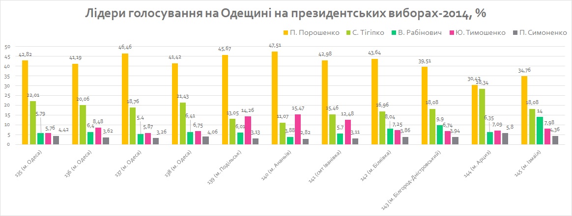 У 2014 році лідером у всіх округах Одещини був чинний президент Петро Порошенко: в середньому він набрав кількість голосів, що співставна з голосами, отриманими нині Володимиром Зеленським. Найбільше виборців проголосували за П. Порошенка на окрузі №140 (центр – м. Ананьїв) - 47,51%. Його найближчий конкурент на тих виборах – Сергій Тігіпко – посів друге місце майже в усіх округах, за винятком №№ 139 і 140, де «срібло» отримала Юлія Тимошенко.