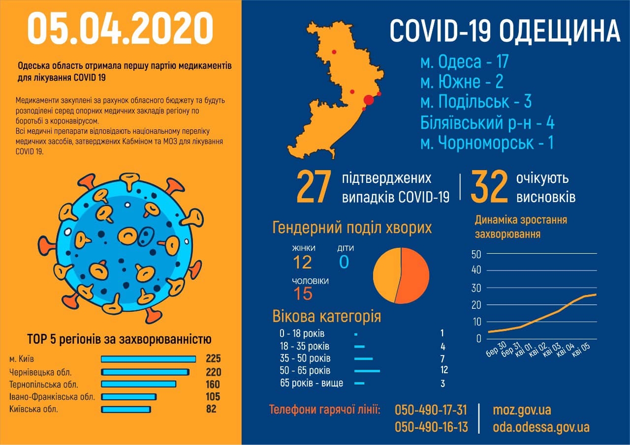 В Одеській області кількість хворих збільшилася до 986. З початку пандемії одужали 368 людей та 18 померли. Наразі на лікуванні перебувают 600 недужих.